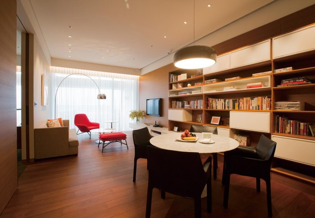 以明亮自然的色調為主,挑高設計,17坪的沈穩空間,衛浴空間也有巧思,紅色清水磚搭配米白磨石子地,展現台灣傳統工藝之美。開闊市景或山景,房型分兩小床或一大床,皆附42吋高畫質電視、DVD播放機、Bose音響設備、光纖上網,Cassina或Minotti設計主椅、迷你酒吧、貼心Nespresso咖啡機,加上雜誌區,享受自在時光。